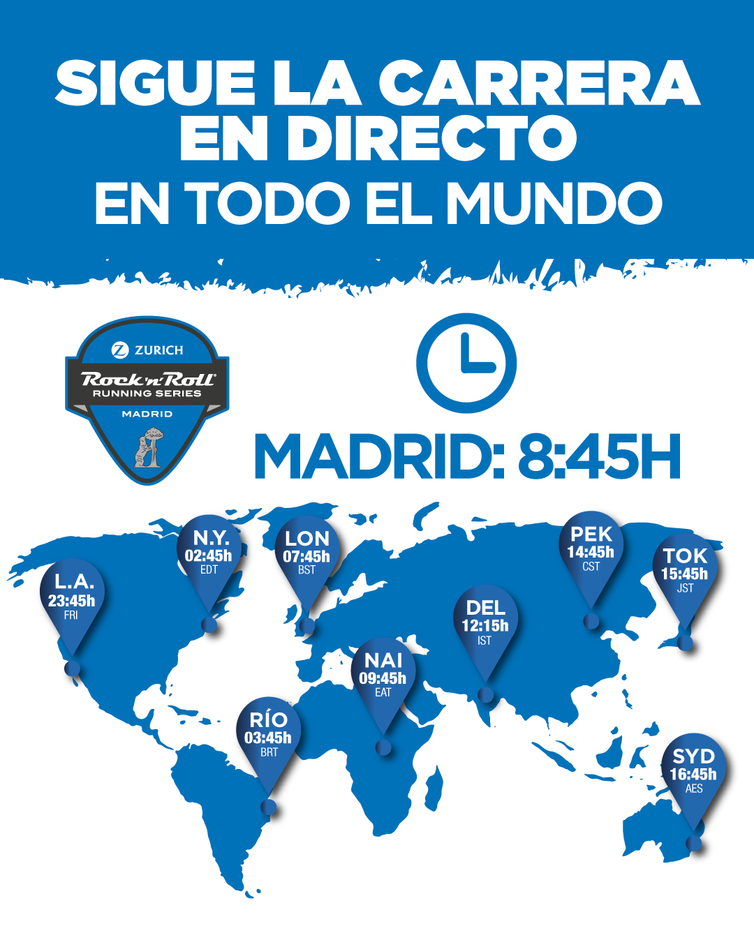 Además de la retransmisión oficial de Telemadrid, santo y seña de la prueba desde hace varios años, la cobertura del Zurich Rock ‘n’ Roll Running Series Madrid está asegurada en cualquier confín del mundo: serán un total de 562 las cadenas que cubrirán esta edición del evento, que ha batido todos los récords de inscripción, con más de 47.000 corredores disfrutando del evento.