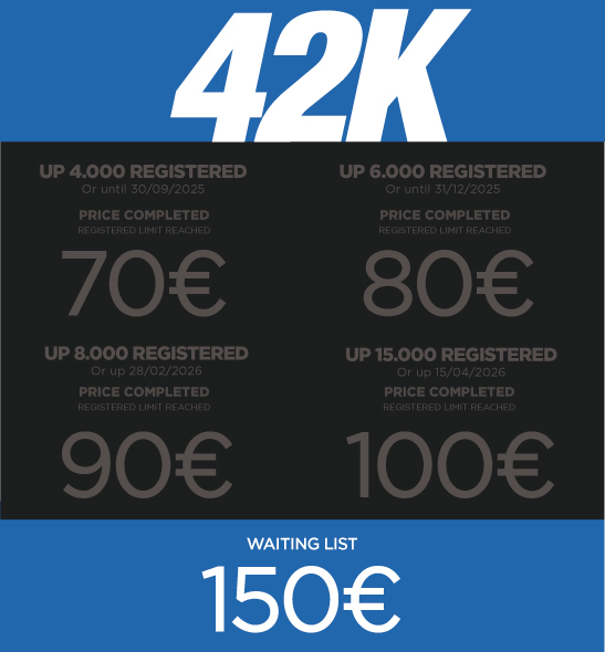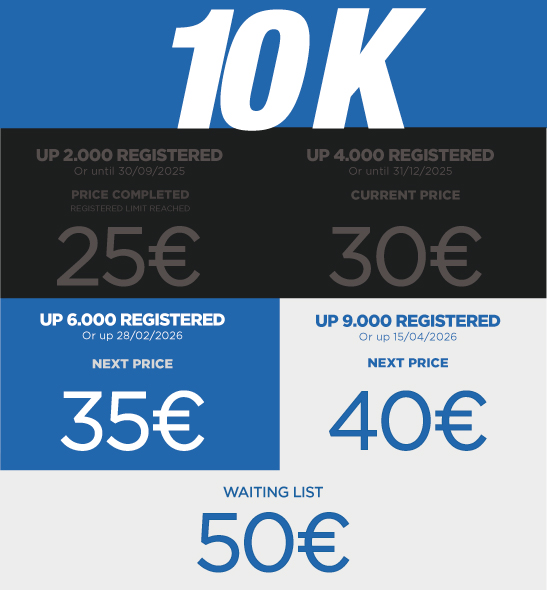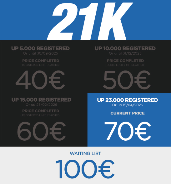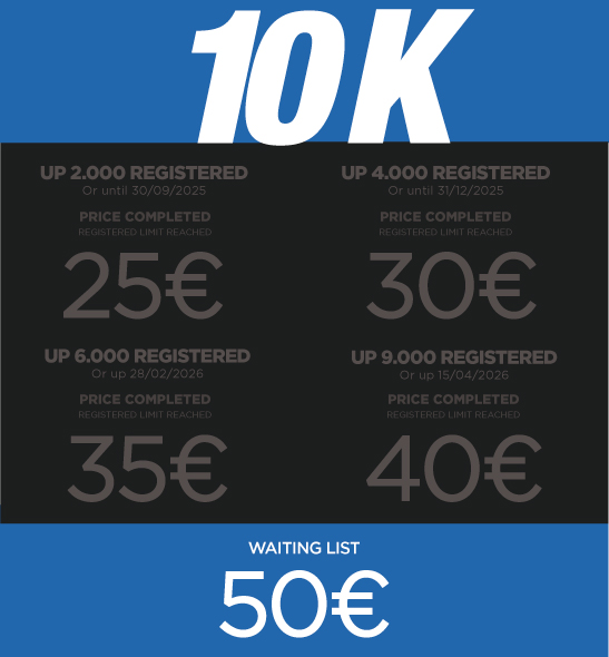 * SPANISH FEDERATION LICENSE NOT INCLUDED – REQUIRED (5€ MARATHON – 3€ HALF AND 10K). ANY PARTICIPANT CAN PURCHASE THE LICENSE THROUGH THE REGISTRATION PROCESS.