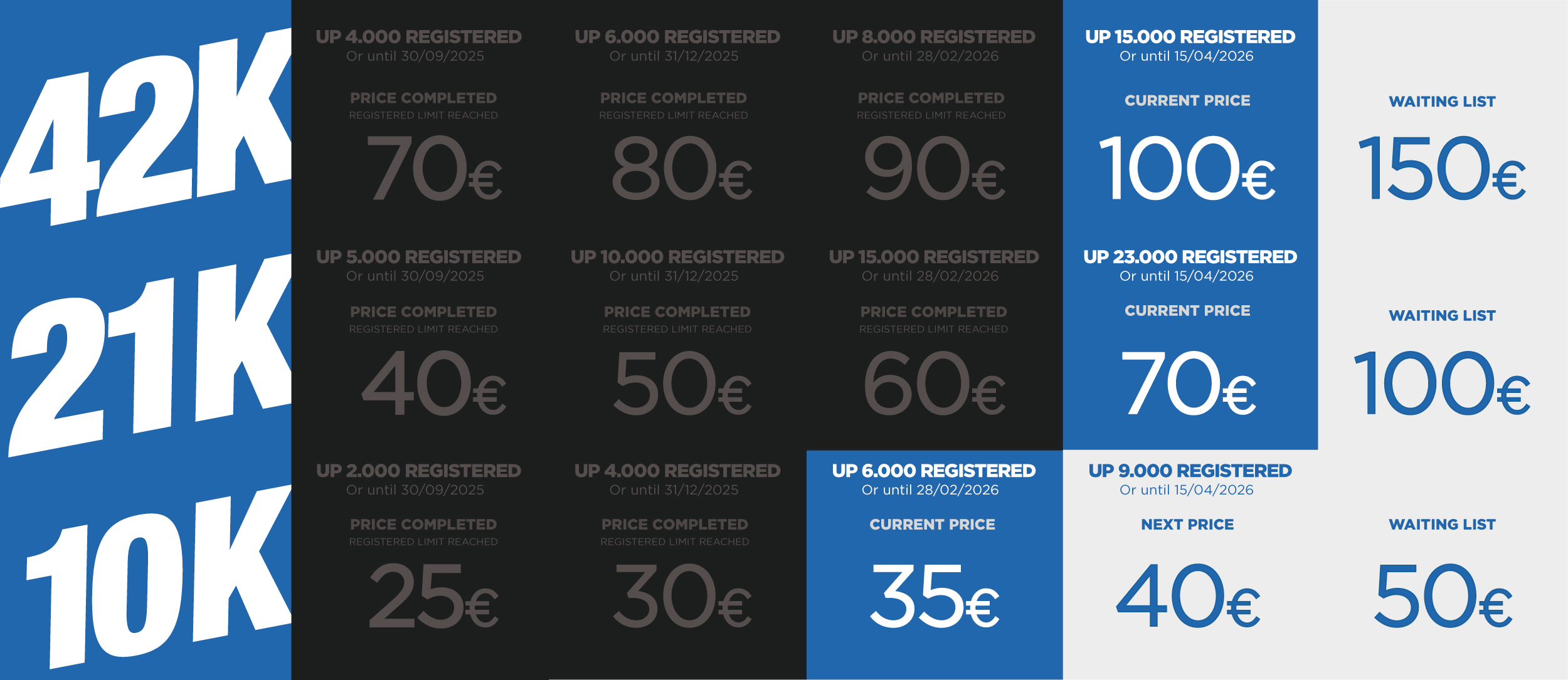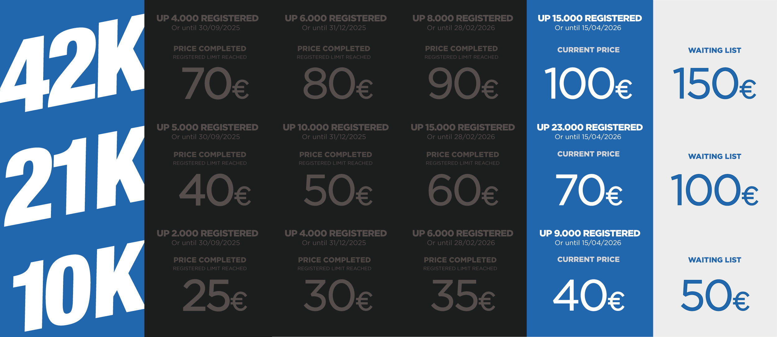 Registrations are 90% refundable when you present a medical note before 31/03/2026 indicating that you suffer an injury that prevents participation in the event.